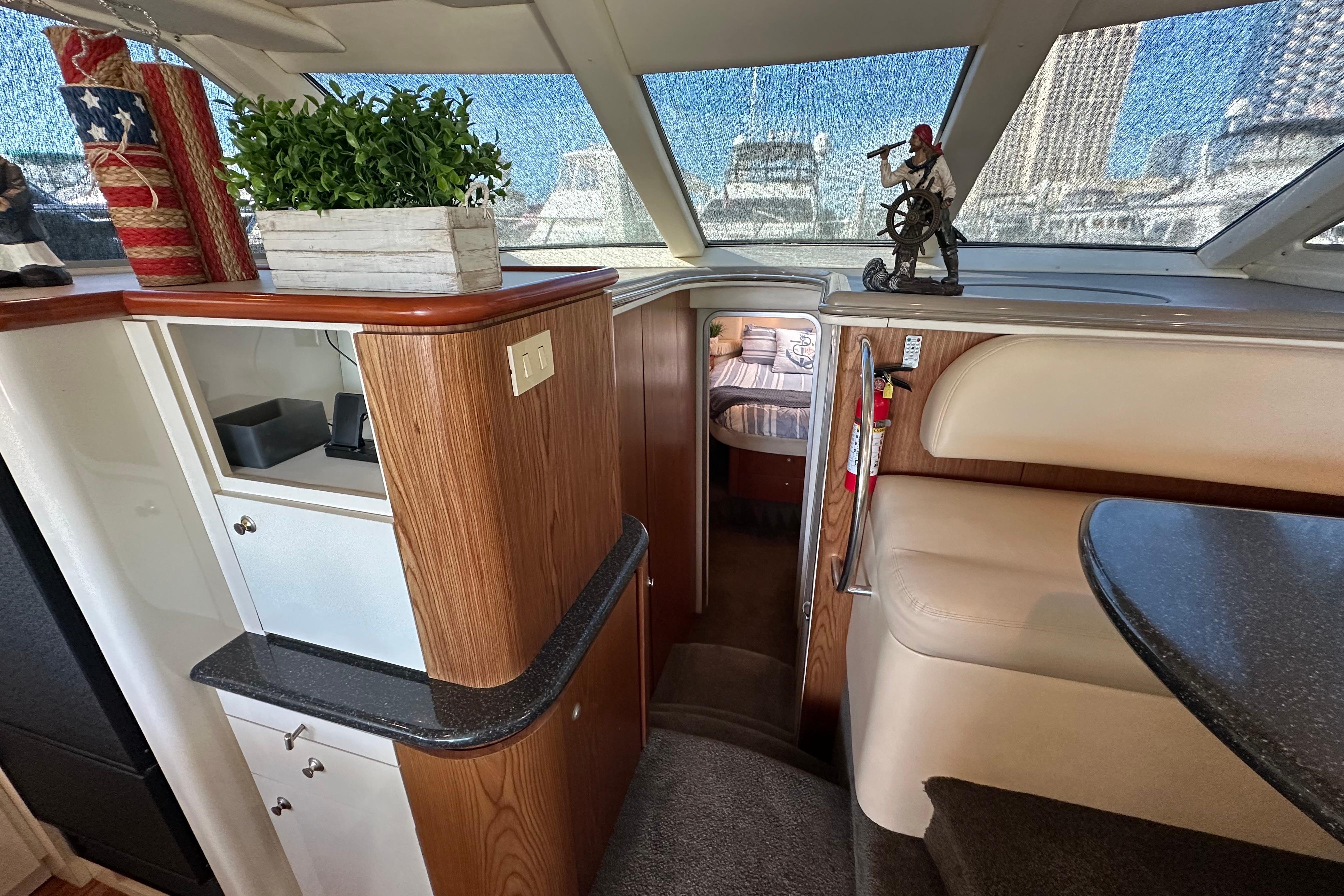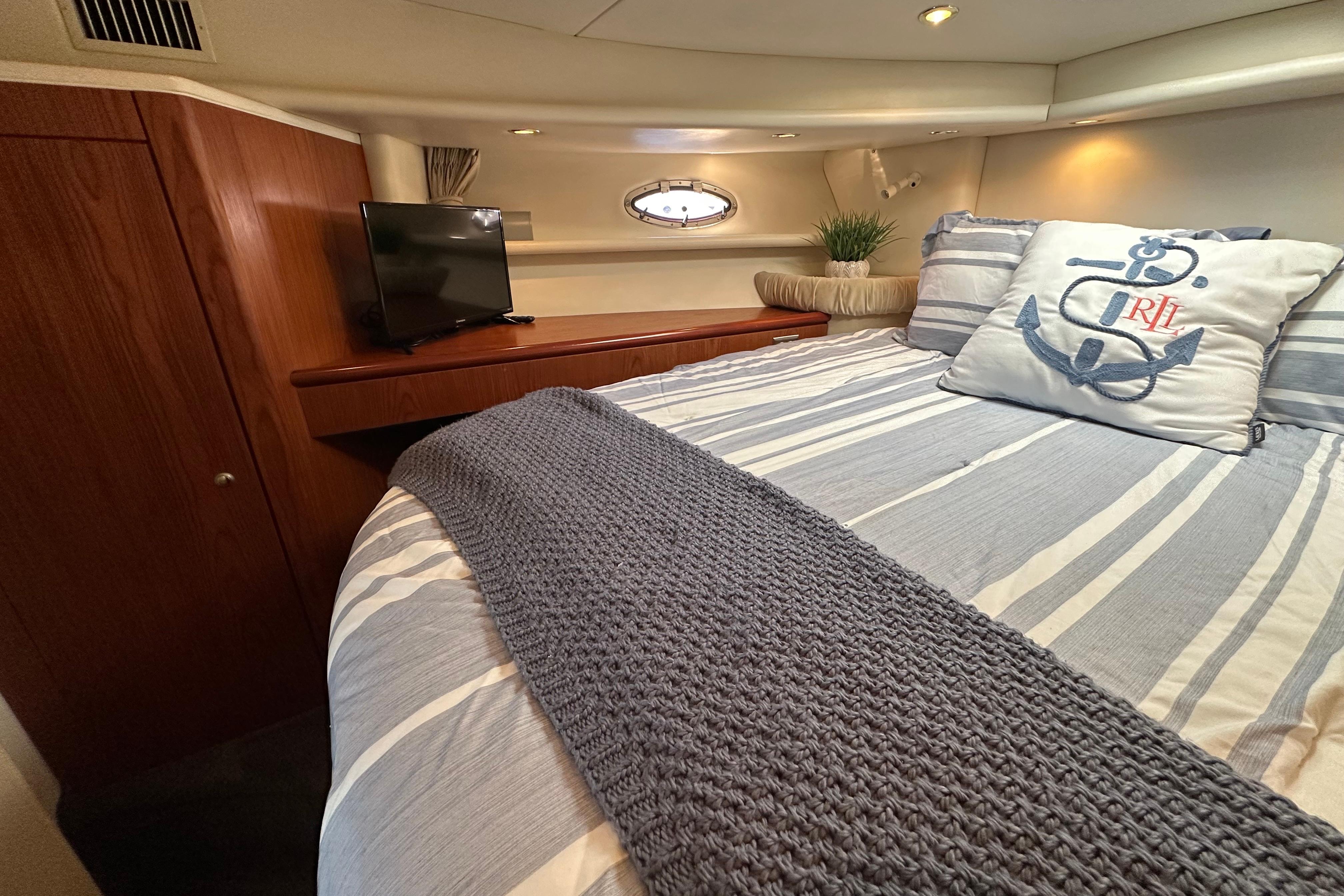 The Maxum 4600 SCB has an aerodynamic design that eases this graceful craft onto a plane quickly and smoothly. Superb tracking and a smooth, stable ride result in easy handling, comfort, and safety. The command bridge station features a double-wide adjustable helm seat plus 360-degree visibility for precision dockside handling. A fully functional entertainment center is conveniently located on the bridge and features a molded-in sink and faucet. The L-shaped lounge provides comfortable space for guests, with stowage under. The interior has abundant headroom, elegant detailing, and rich textures. There\'s Berber carpeting, Corian surfaces, and Ultraleather coverings. Muted colors and rich woods are accented with strategic lighting, and soft curves echo the sleek design of the exterior. The midcabin provides twin-size berths, a 110-volt outlet, and an illuminated cedar-lined closet