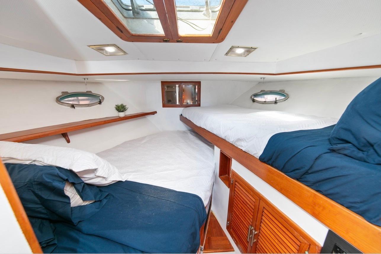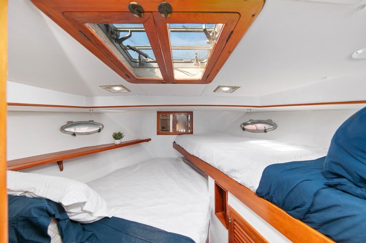 - Versatile layout with a double lower berth to port and a single upper berth with cabinetry to starboard
